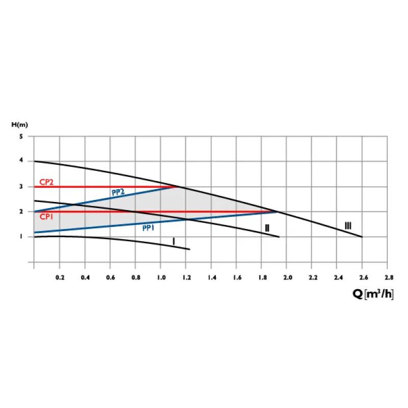- Two Proportional Pressure Modes (PP1 and PP2): The pump adjusts its operation in response to pressure differences, proportionate to the flow rate.