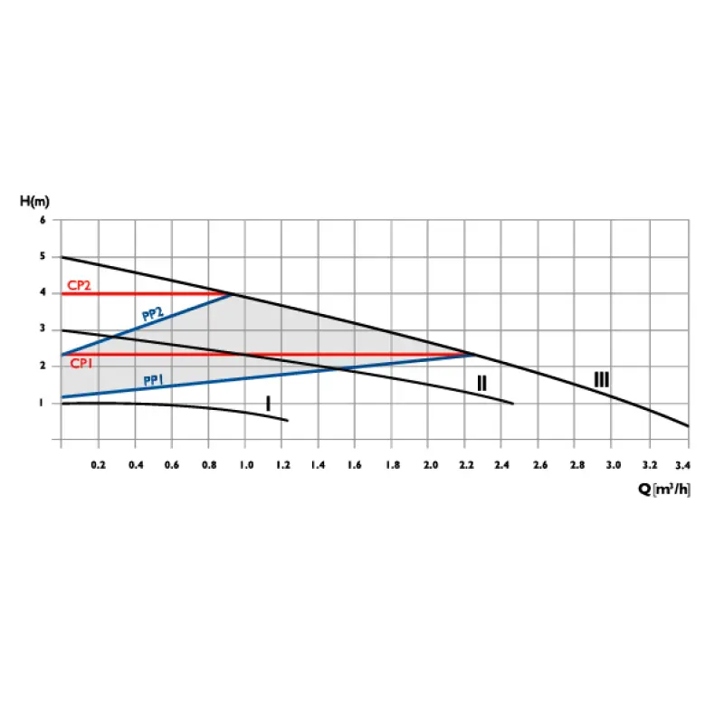 - Two Proportional Pressure Modes (PP1 and PP2): The pump adjusts its operation in response to pressure differences, proportionate to the flow rate.